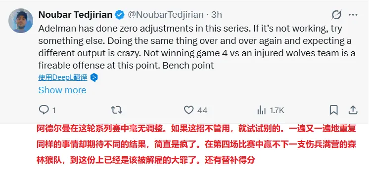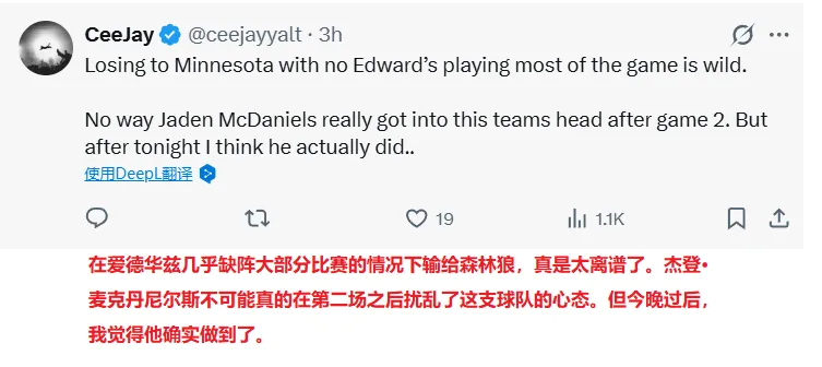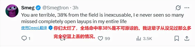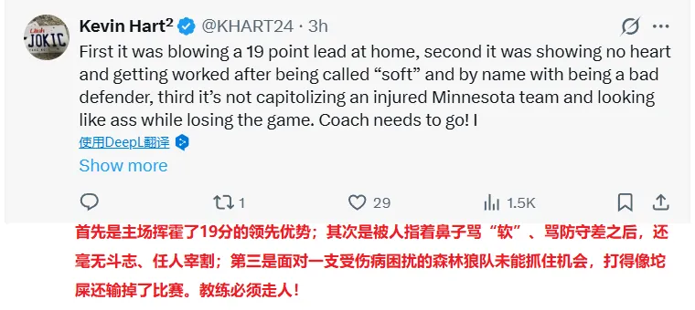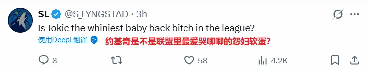 NBA季后赛,掘金96-112不敌森林狼,总比分1-3被对手夺得赛点。约基奇投篮22中8,罚球8中8,贡献24分15篮板9助攻3抢断的准三双数据,但是他全场出现4次失误,并且末节被戈贝尔防得6中0,还在最后时刻与对手发生冲突被驱逐。